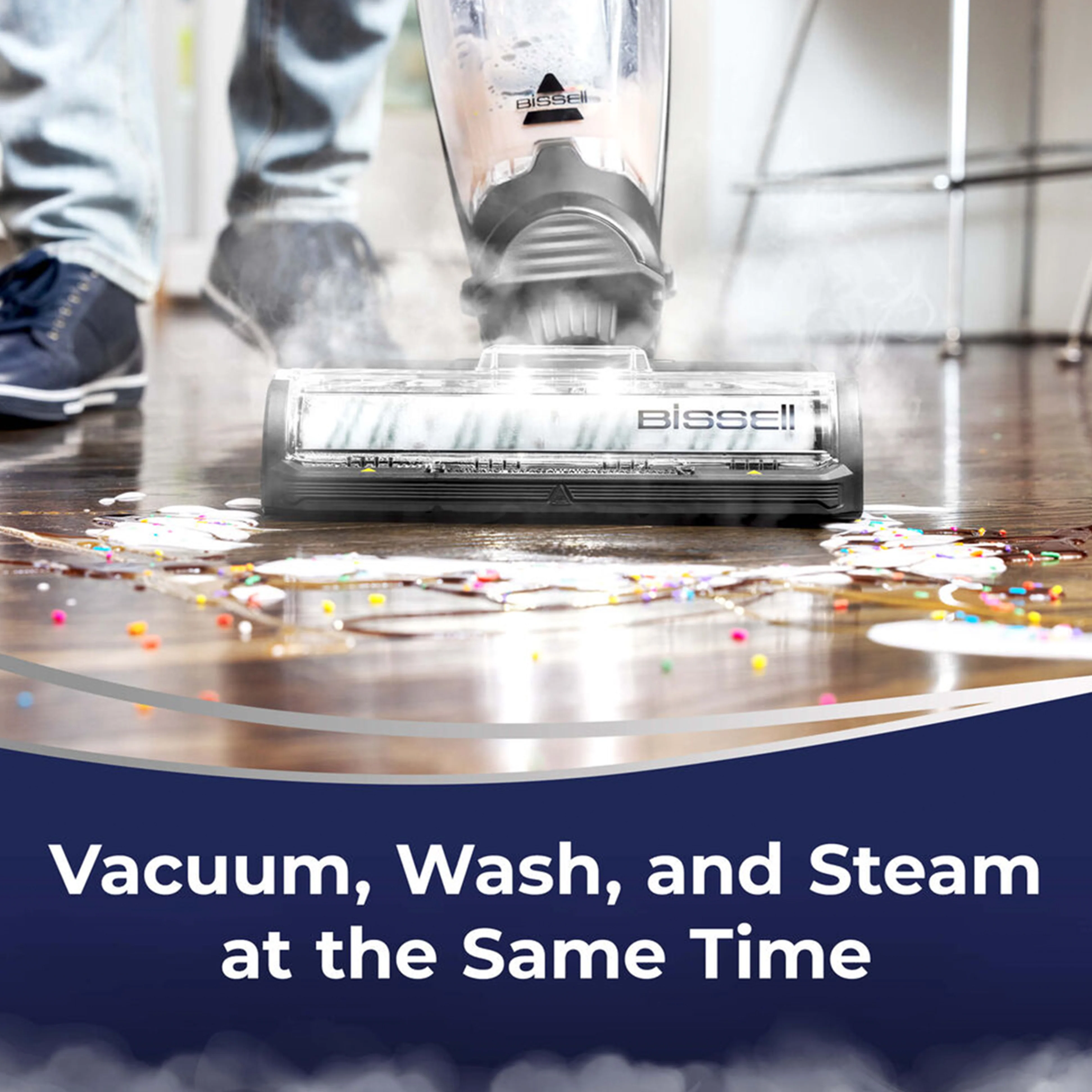 Proven to clean sticky messes up to 20% better, CrossWave HydroSteam uses a combination of specialised cleaning formula with HydroSteam Technology to vacuum, wash, & steam across sealed hard floors and low-pile area rugs.